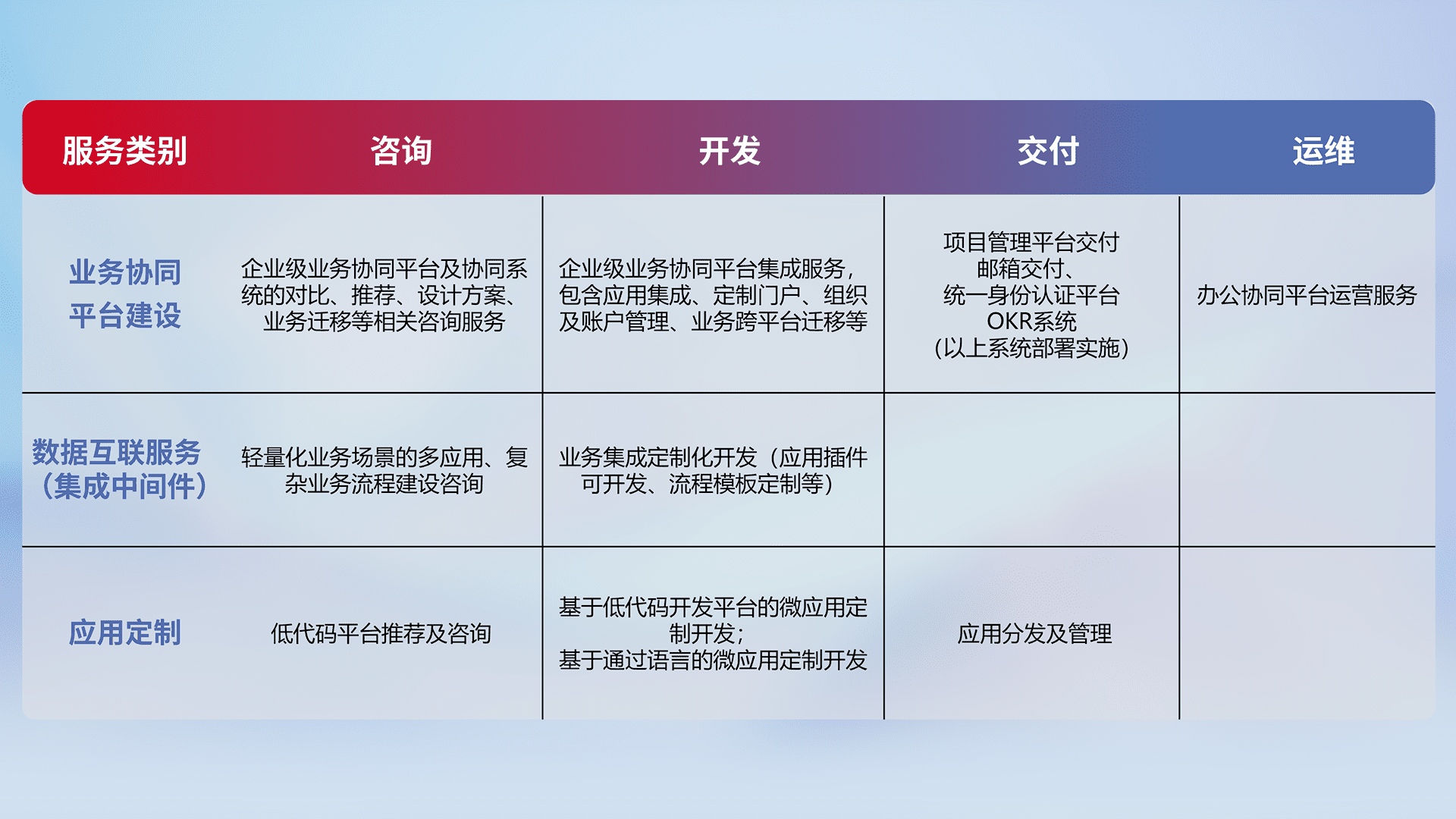 针对钉钉、、、企微、、、IDaas等平台级产品提供产品的规划、、、、方案、、、交付、、、、定制化开发等服务,,,实现如统一协同办公、、、智能客户服务、、混合会议管理、、、、智能数据查询、、、、等业务场景,,实现数字化转型。。。